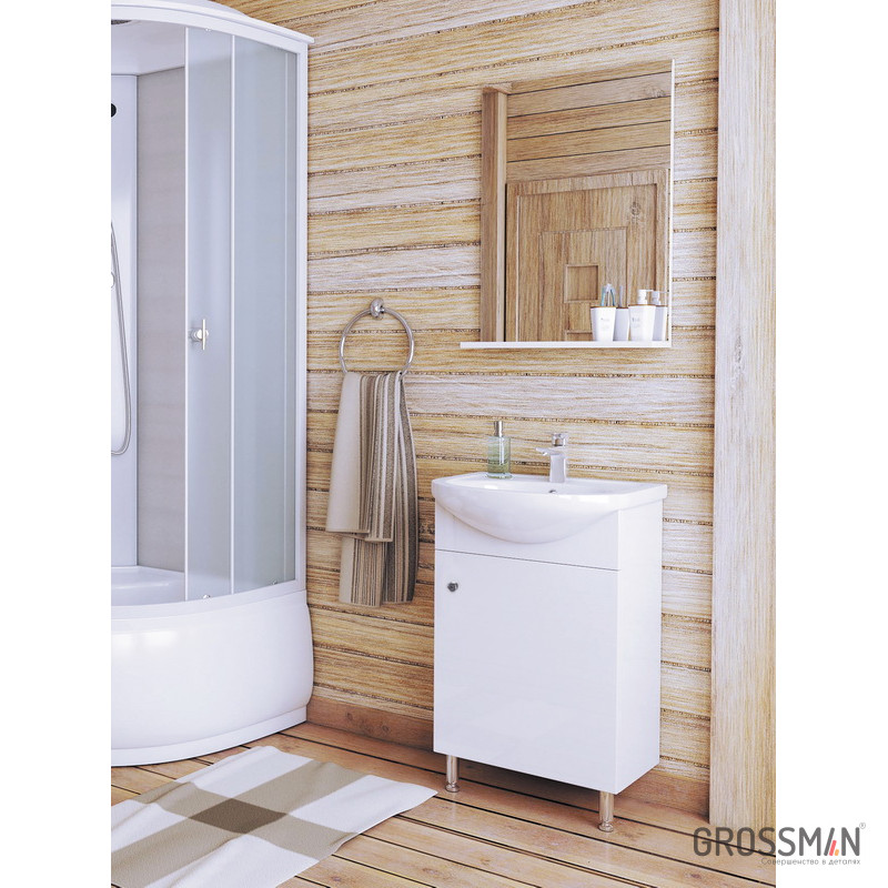 Распашная дверь с элегантной ручкой скрывают вместительное пространство для хранения, разделенное полкой, зеркало укомплектовано полочкой, что позволяет разместить все необходимое.