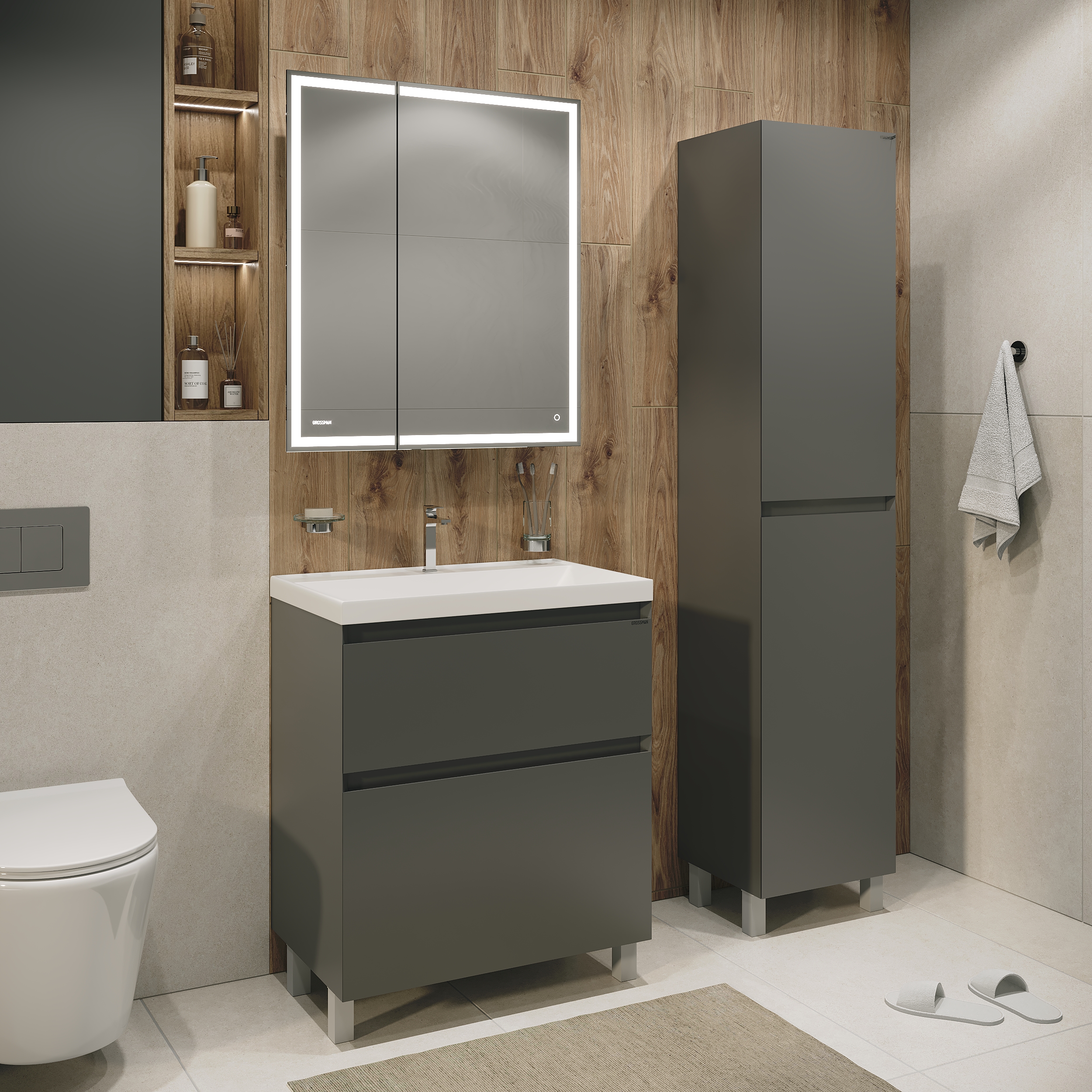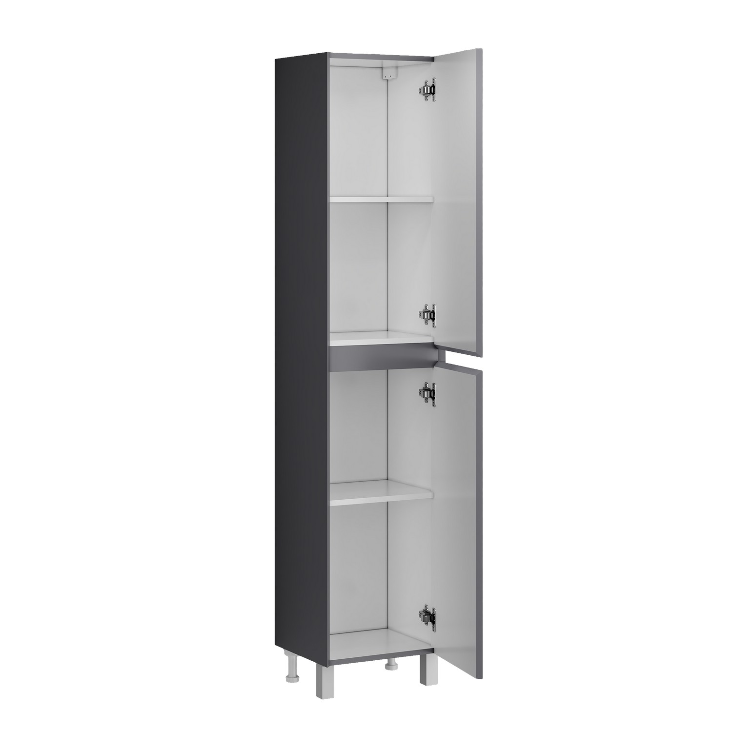 Напольный пенал для ванной «МЕРКАДО-40 см», графит матовый – компактное и функциональное решение для хранения в ванной комнате. Корпус и фасады выполнены из МДФ в матовой краске в цвете графит. Фасады с точным запилом под 45° на торцах, что исключает видимую кромку и позволяет обходиться без ручек, создавая аккуратный и минималистичный дизайн. Пенал оснащён тремя полками для удобного хранения и петлями с доводчиком, обеспечивающими плавное и бесшумное закрывание дверцы. Модель установлена на хромированные ножки высотой 10 см, а для надёжного крепления предусмотрены подвесы в комплекте. Отличное решение для тех, кто ценит современный стиль, практичность и компактность мебели для ванной комнаты.