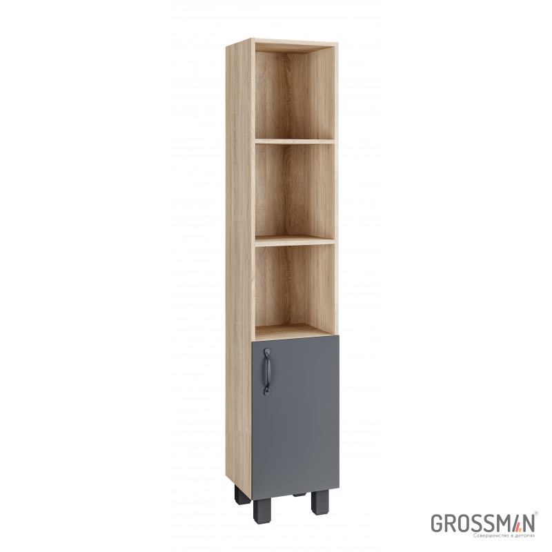 В пенале Флай 30 см сочетаются контрастные цвета и фактуры: серый матовый фасад с покрытием SoftTouch, корпус цвета дуба с текстурой, черная матовая фурнитура.