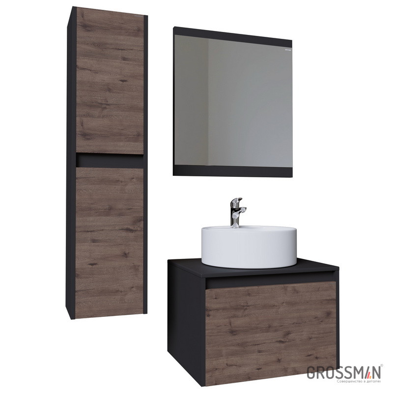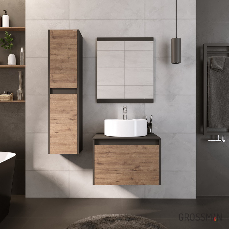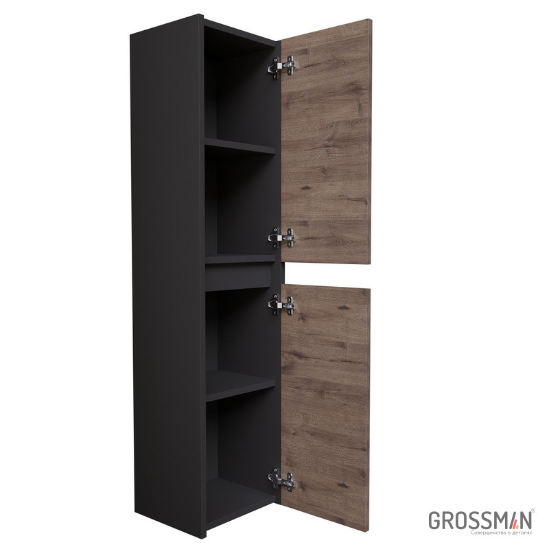 делают мебель удобной и практичной в эксплуатации. Корпус и фасады пенала выполнены из влагостойких материалов, устойчивых к перепадам температуры и высокой влажности, крепится к стене и не занимает место на полу. Корпус: ЛДСП графит; фасады: ЛДСП веллингтон. Пенал поможет разместить в небольшой ванной комнате все необходимые принадлежности.