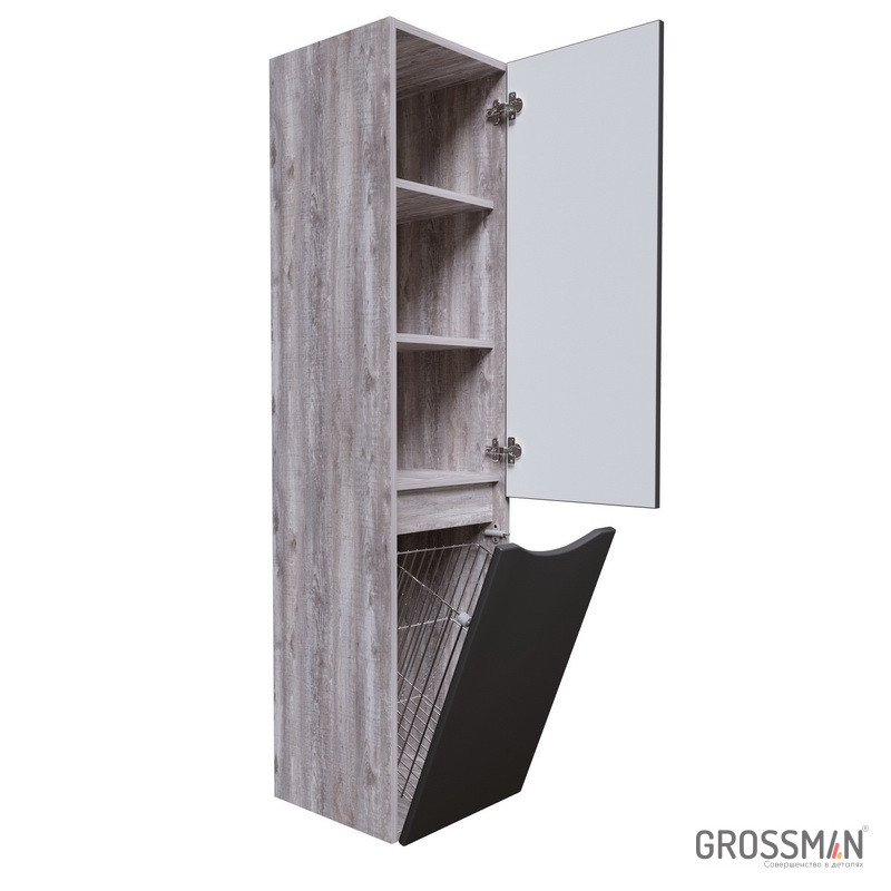 Подвесной пенал Талис-35 образует дополнительное пространство для хранения средств гигиены и аксессуаров, обеспечивая максимальную эргономичность ванной комнаты. Внутреннее пространство пенала поделено полками из ЛДСП на 3 секции. Пенал поможет разместить в небольшой ванной комнате все необходимые принадлежности. Система хранения представлена вместительным отделением с двумя полками из ЛДСП за распашной дверью и бельевой корзиной за откидным фасадом. Дверь снабжена механизмом плавного закрывания. Корпус и фасады тумбы выполнены из влагостойких материалов, устойчивого к перепадам температуры и высокой влажности, крепится к стене и не занимает место на полу. Корпус: ЛДСП бетон пайн; фасады: МДФ, ПВХ - пленка графит матовый.