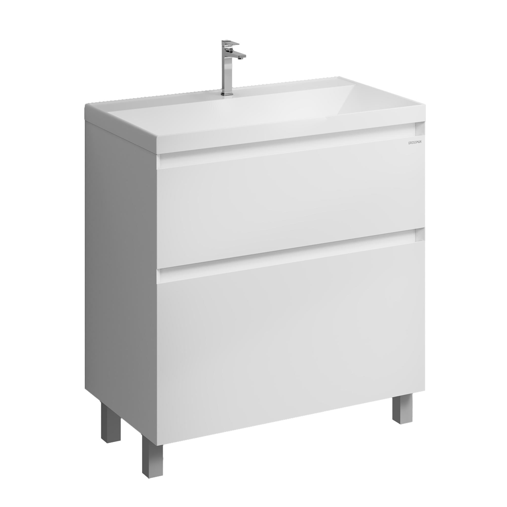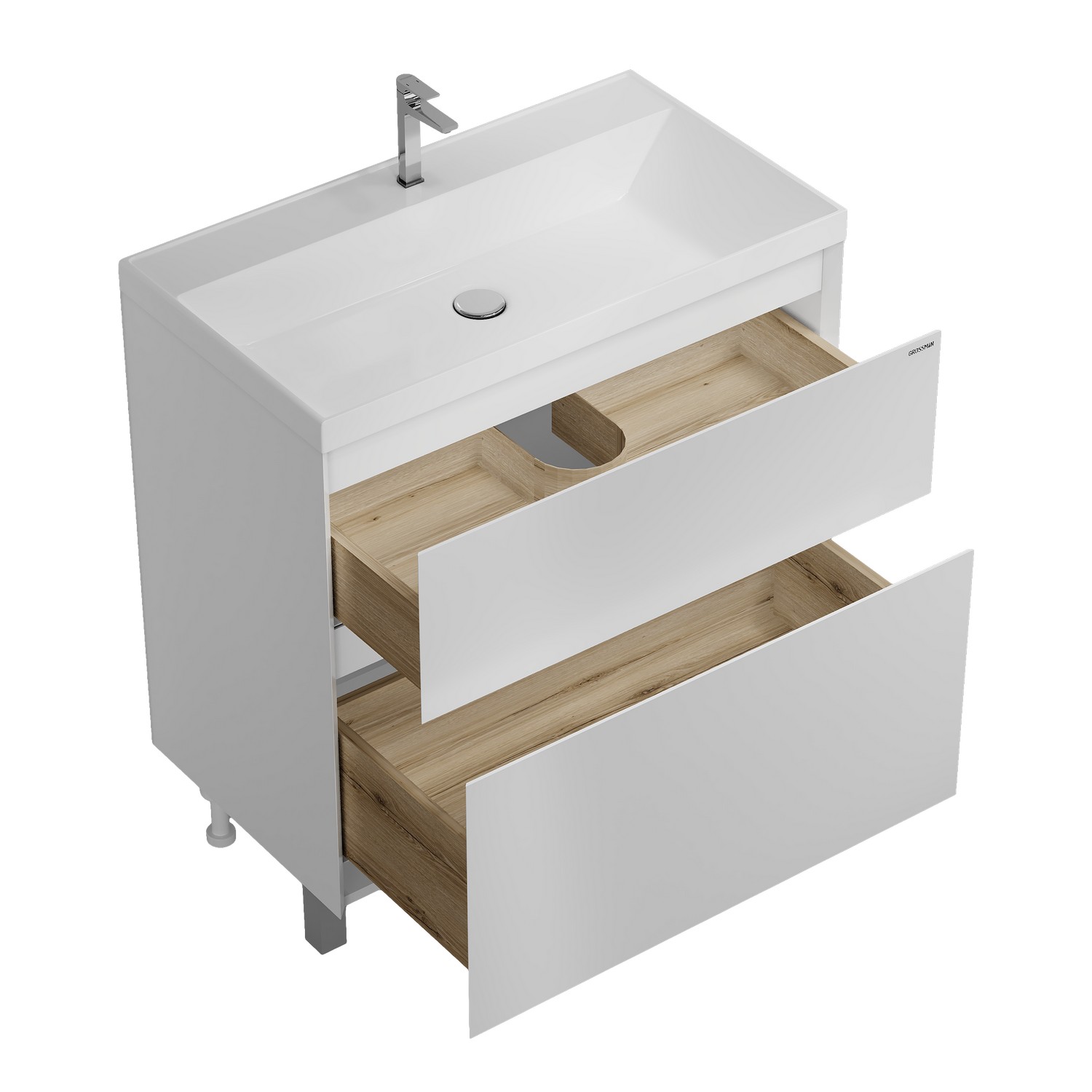 Тумба напольная для ванной «МЕРКАДО-70 см», белая матовая – стильное и функциональное решение для интерьеров в скандинавском и современном стиле. Корпус и фасады выполнены из МДФ в белой матовой краске. Фасады с точным запилом под 45° на торцах, что исключает видимую кромку и позволяет обходиться без ручек, создавая аккуратный и минималистичный дизайн. Два вместительных ящика изготовлены из ЛДСП «дуб Эльвезия» и оснащены направляющими скрытого монтажа с доводчиком для плавного и бесшумного закрывания. Тумба установлена на хромированные ножки высотой 10 см, а для надежного крепления предусмотрены подвесы в комплекте. Модель совместима с умывальником Классика-80. Представлена в трёх размерах (60, 70, 80 см), двух цветах (белый и графит матовый) и двух вариантах исполнения (напольная и подвесная). Отличный выбор для тех, кто ценит современный минимализм, практичность и высокое качество мебели для ванной комнаты.