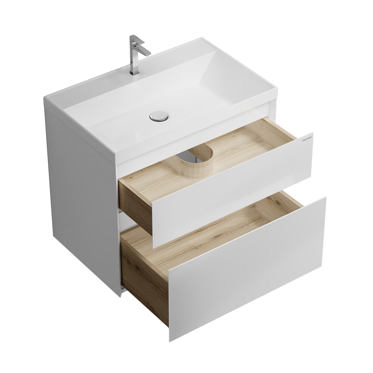 Подвесная тумба для ванной «МЕРКАДО-70 см», белая матовая – современное и практичное решение для интерьеров в скандинавском и современном стиле. Корпус и фасады выполнены из МДФ в белой матовой краске. Фасады с точным запилом под 45° на торцах, что исключает видимую кромку и позволяет обходиться без ручек, создавая минималистичный и аккуратный дизайн. Два вместительных ящика изготовлены из ЛДСП «дуб Эльвезия» и оснащены направляющими скрытого монтажа с доводчиком, обеспечивающими плавное и бесшумное закрывание. Для надёжного крепления к стене предусмотрены подвесы в комплекте. Модель совместима с умывальником Классика-70. Представлена в трёх размерах (60, 70, 80 см). Отличный выбор для тех, кто ценит современный минимализм, функциональность и высокое качество мебели для ванной комнаты.