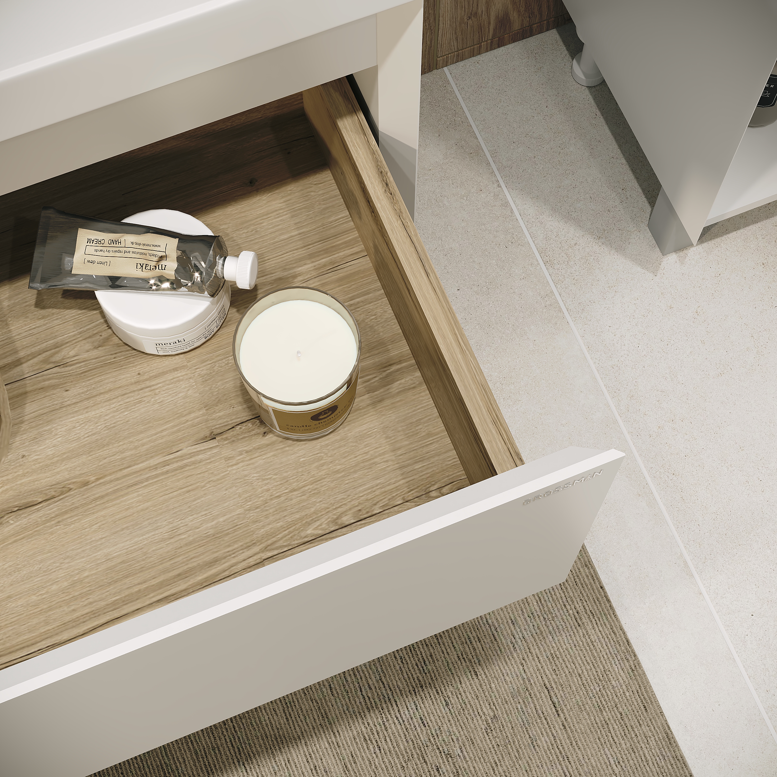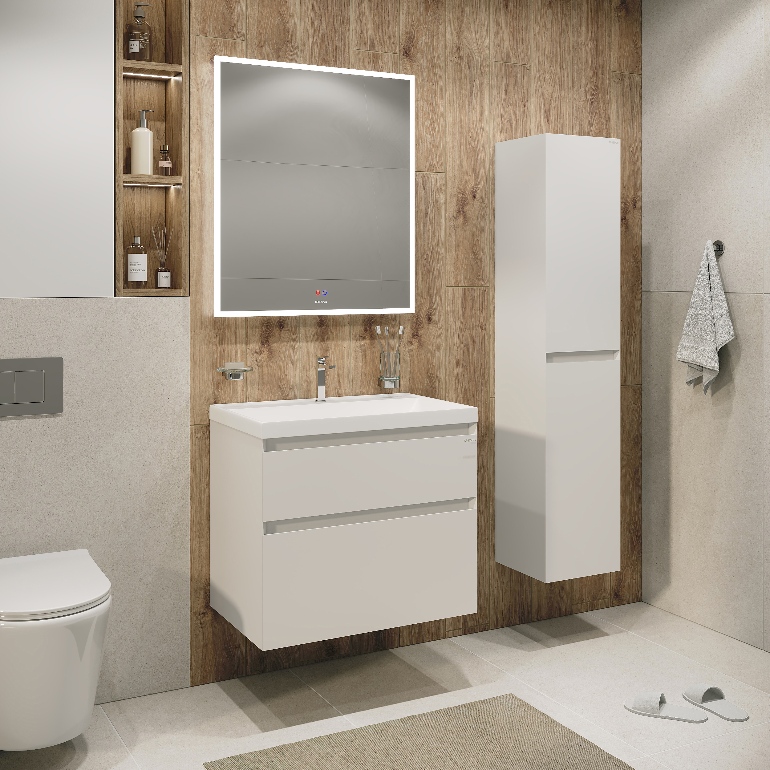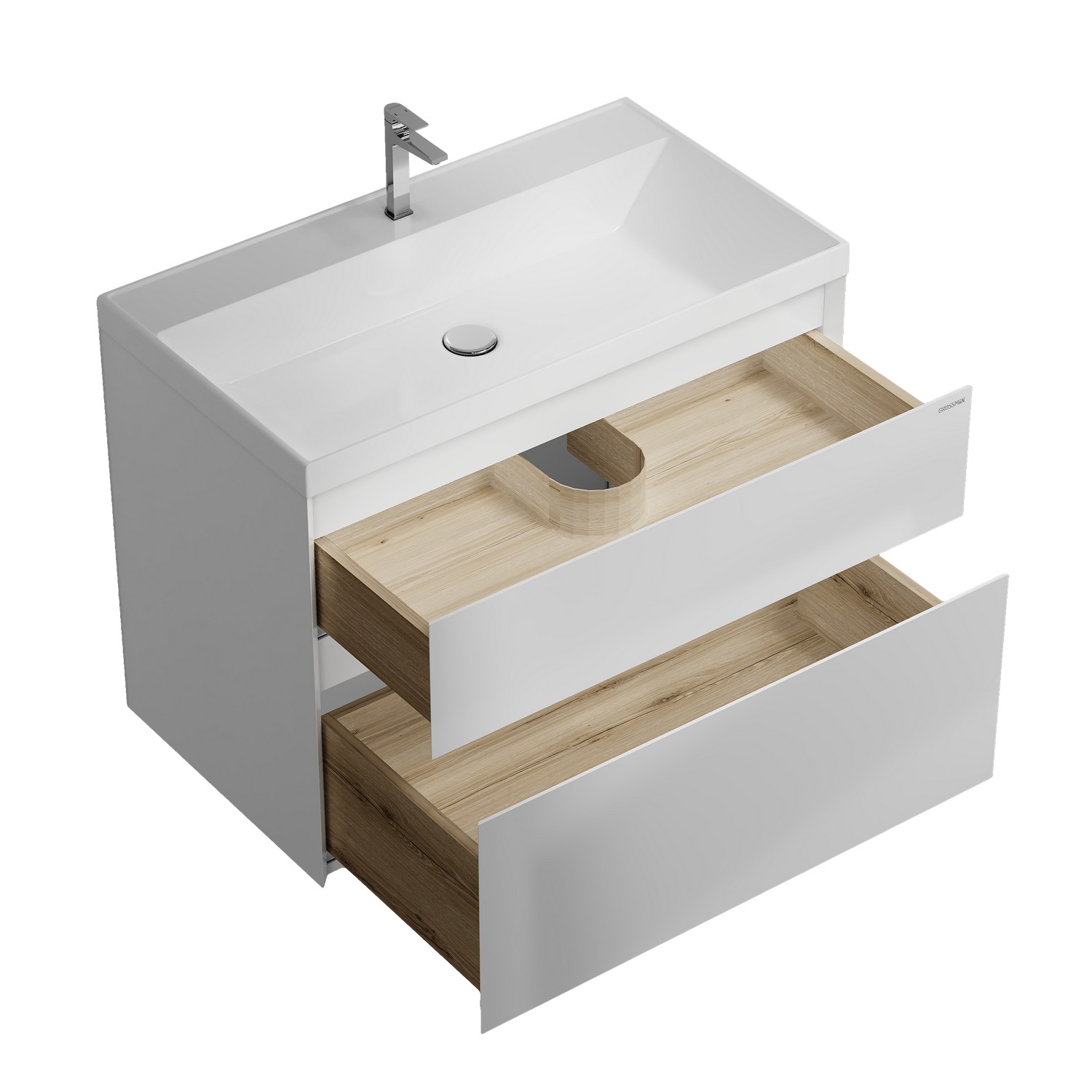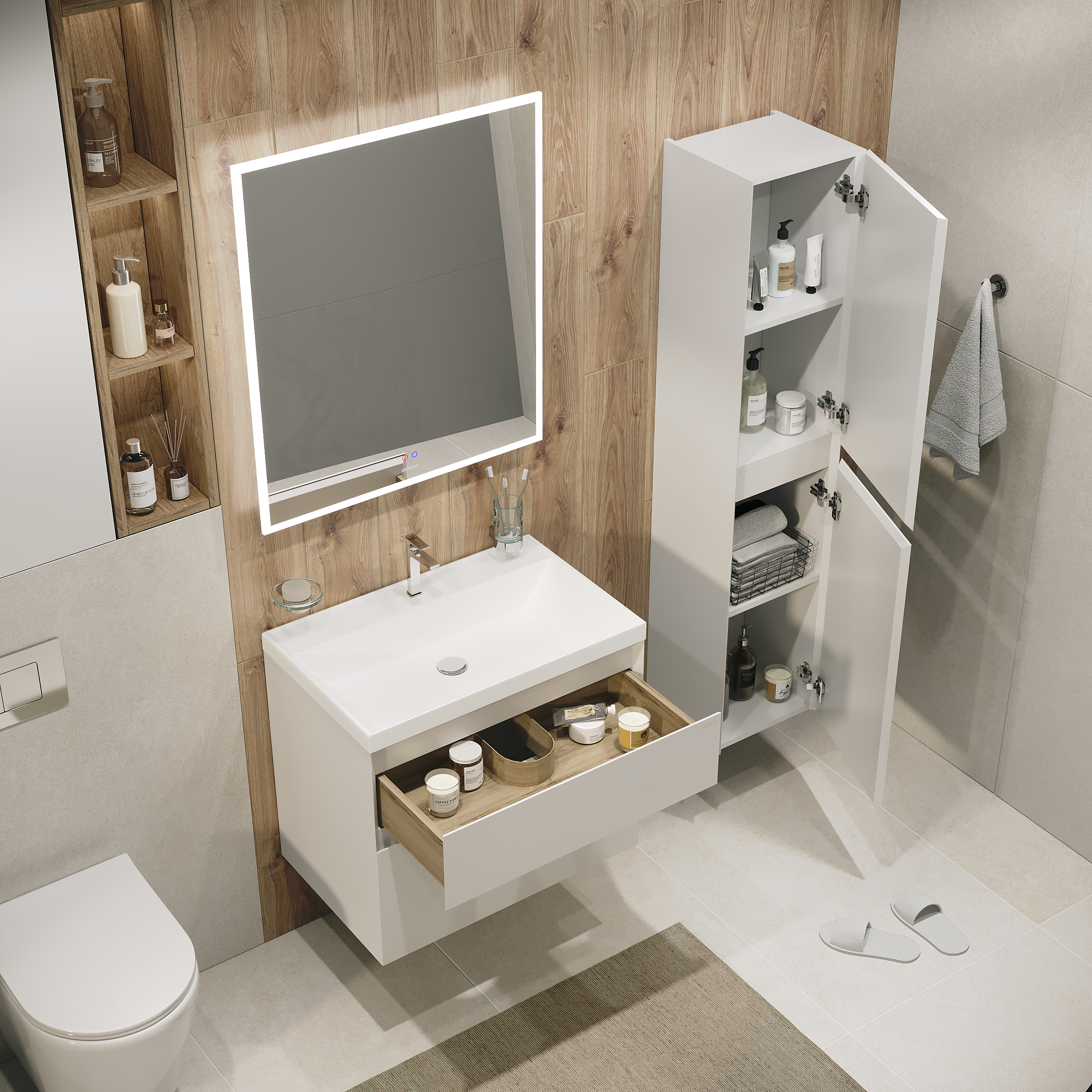 Подвесная тумба для ванной «МЕРКАДО-80 см», белая матовая – современное и практичное решение для интерьеров в скандинавском и современном стиле. Корпус и фасады выполнены из МДФ в белой матовой краске. Фасады с точным запилом под 45° на торцах, что исключает видимую кромку и позволяет обходиться без ручек, создавая минималистичный и аккуратный дизайн. Два вместительных ящика изготовлены из ЛДСП «дуб Эльвезия» и оснащены направляющими скрытого монтажа с доводчиком, обеспечивающими плавное и бесшумное закрывание. Для надёжного крепления к стене предусмотрены подвесы в комплекте. Модель совместима с умывальником Классика-80. Представлена в трёх размерах (60, 70, 80 см). Отличный выбор для тех, кто ценит современный минимализм, функциональность и высокое качество мебели для ванной комнаты.
