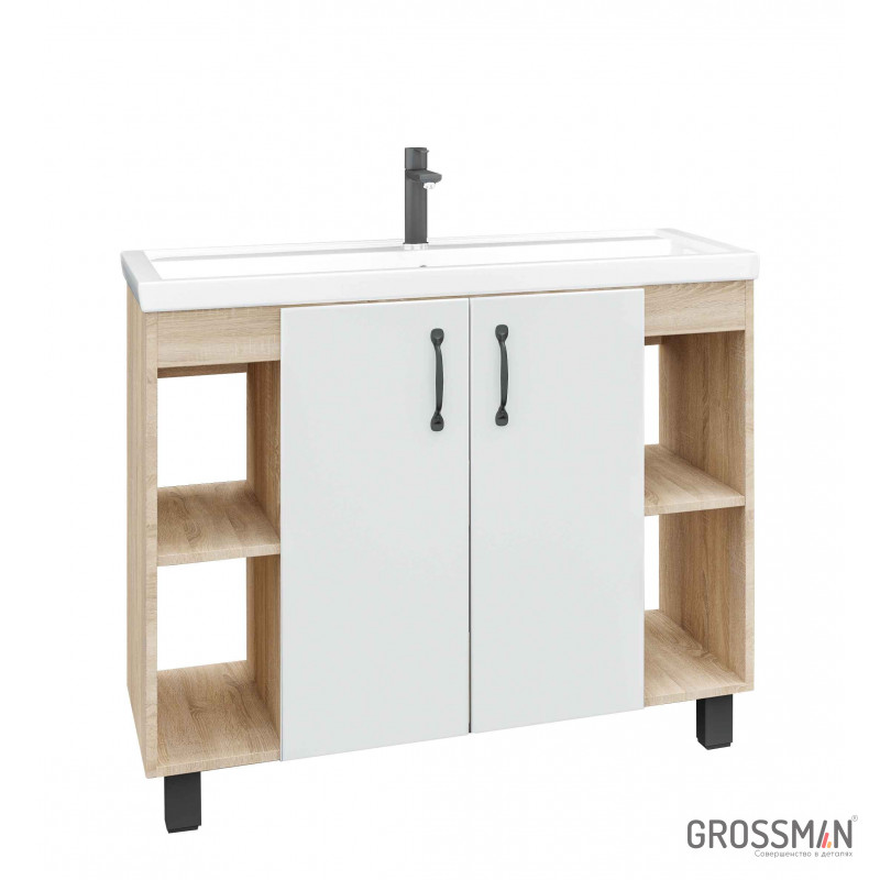 В тумбе Флай 100 см сочетаются контрастные цвета и фактуры: белый матовый фасад с покрытием SoftTouch, корпус цвета дуба с текстурой, черная матовая фурнитура.