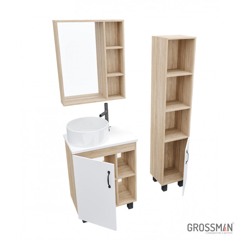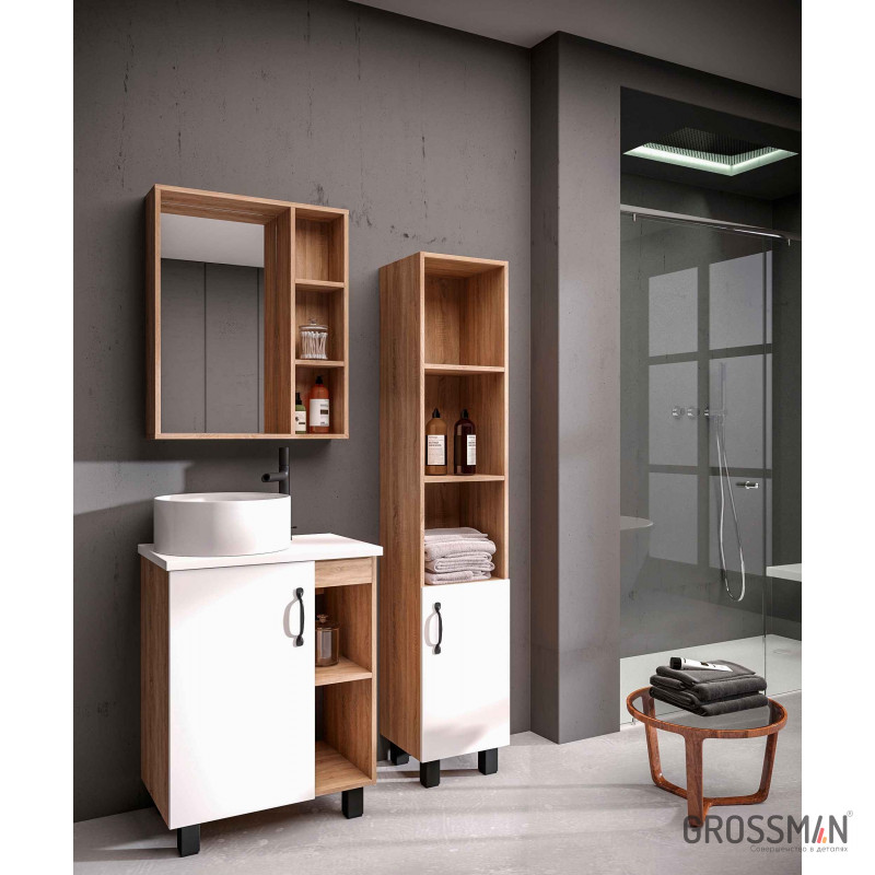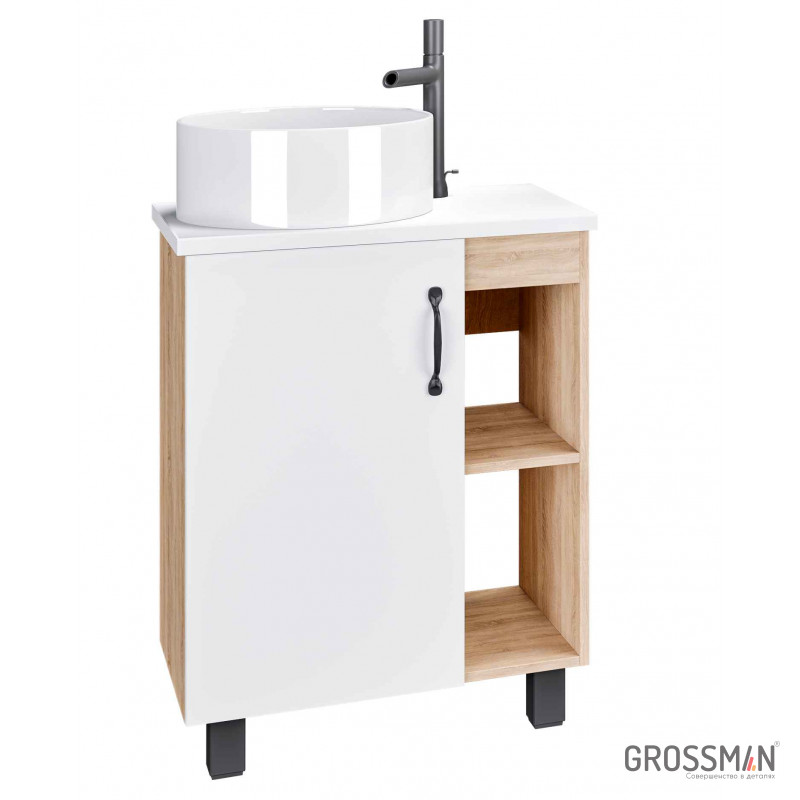 В тумбе Флай 60 см сочетаются контрастные цвета и фактуры: белый матовый фасад с покрытием SoftTouch, корпус цвета дуба с текстурой, черная матовая фурнитура.