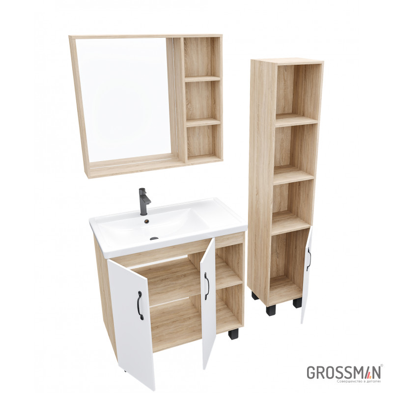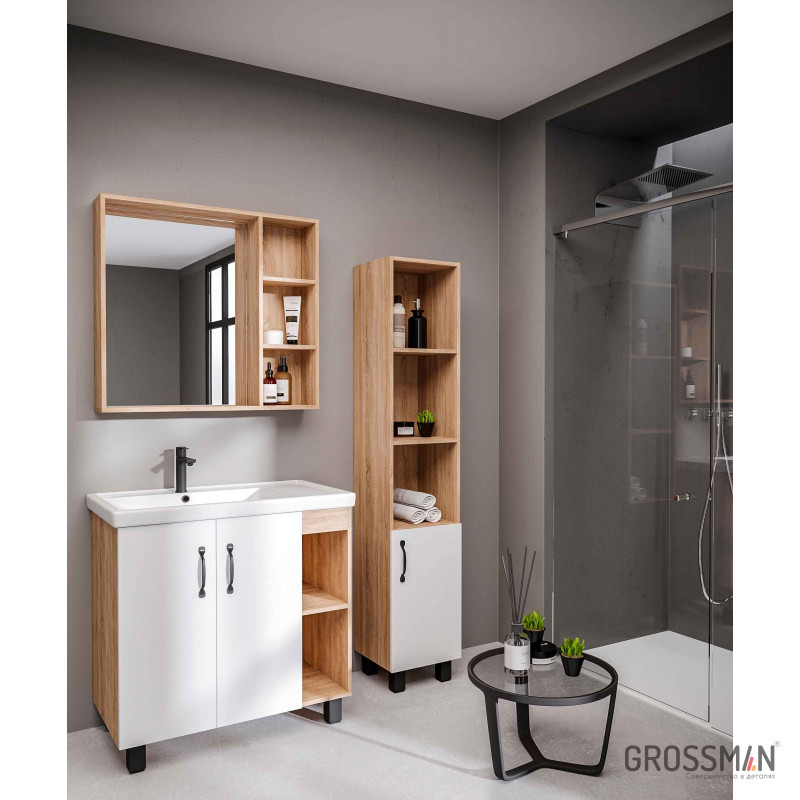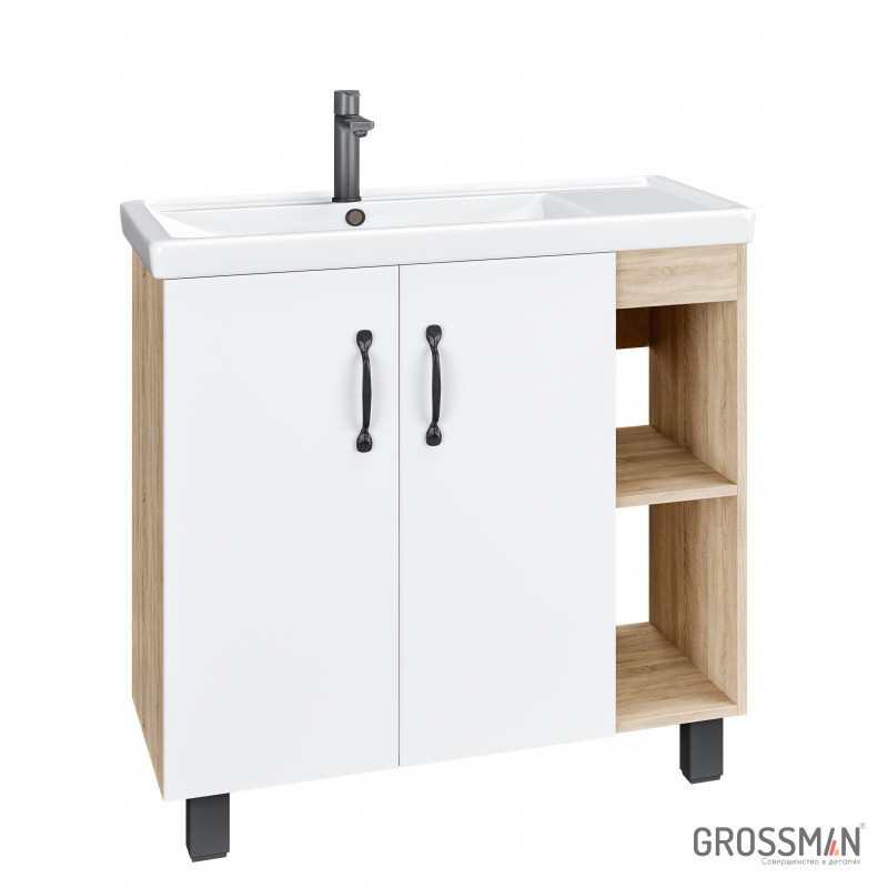 В тумбе Флай 80 см сочетаются контрастные цвета и фактуры: белый матовый фасад с покрытием SoftTouch, корпус цвета дуба с текстурой, черная матовая фурнитура.
