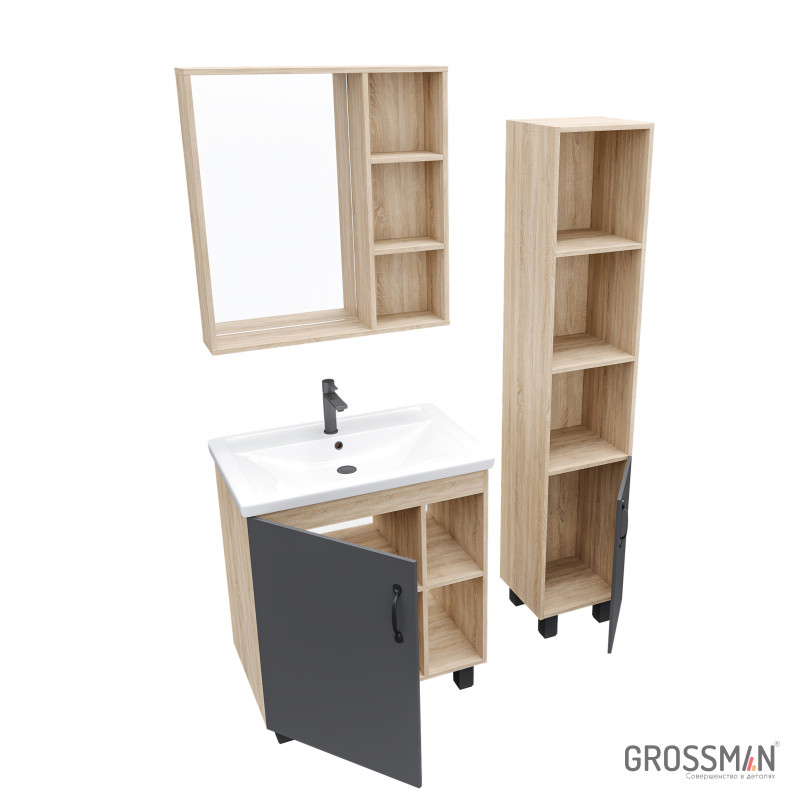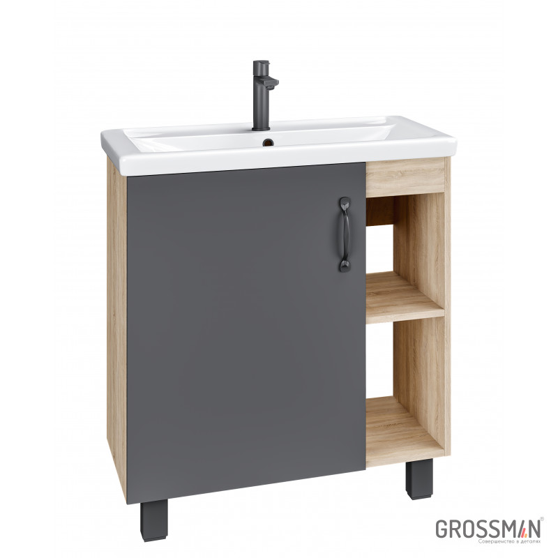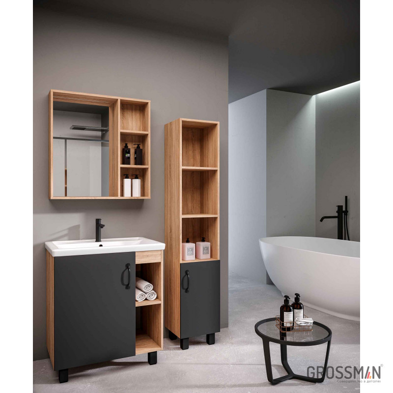 В тумбе Флай 70 см сочетаются контрастные цвета и фактуры: серый матовый фасад с покрытием SoftTouch, корпус цвета дуба с текстурой, черная матовая фурнитура.