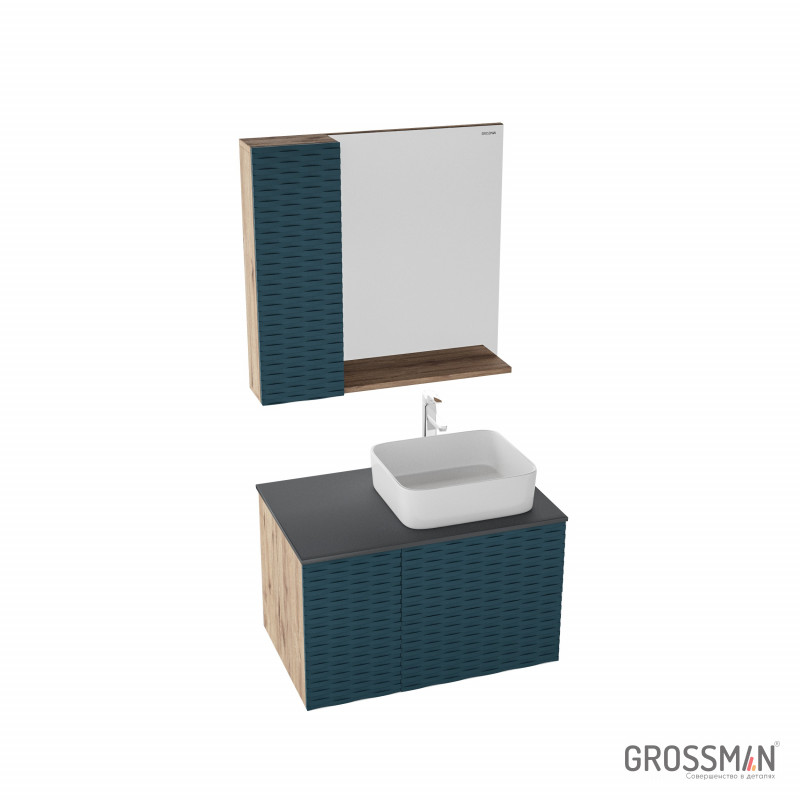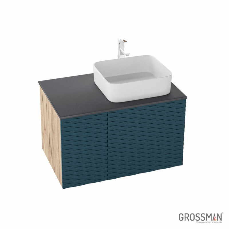 Корпус тумбы выполнен из влагостойкого ЛДСП, фасады ящиков и двери - из МДФ 3D (плетенка) в матовой пленке Soft Touch цвета бриз, столешница из МДФ в матовой пленке в цвете графит устойчивых к перепадам температур и высокой влажности. Тумба крепится к стене.