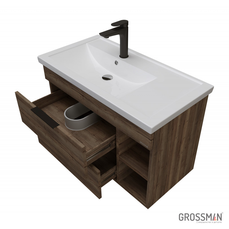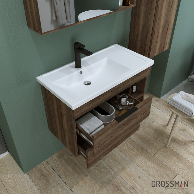 Тумба подвесная Форта 80 см - роскошная текстура и темный цвет дуба, а матовые металлические ручки добавляют современный дизайн и строгий стиль.