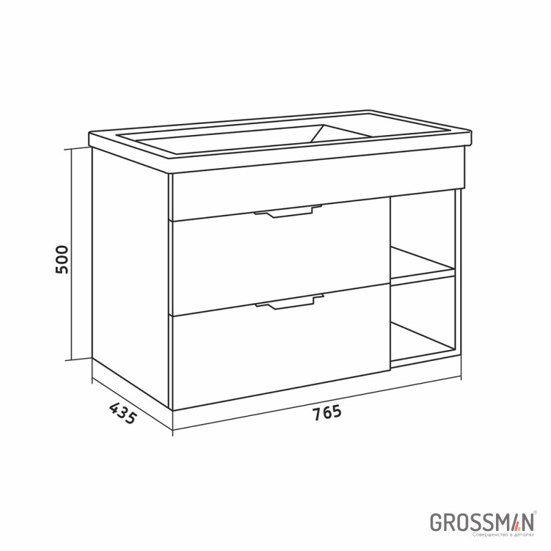 Тумба снабжена двумя ящиками, которые укомплектованы направляющими плавного закрывания, ящики предназначены для хранения различных предметов, а открытые полки справа обеспечивают доступ к аксессуарам.