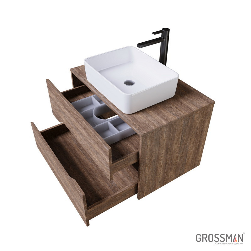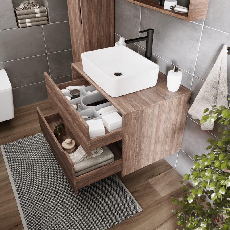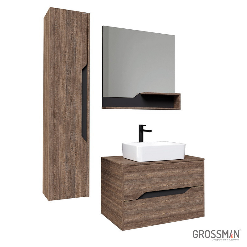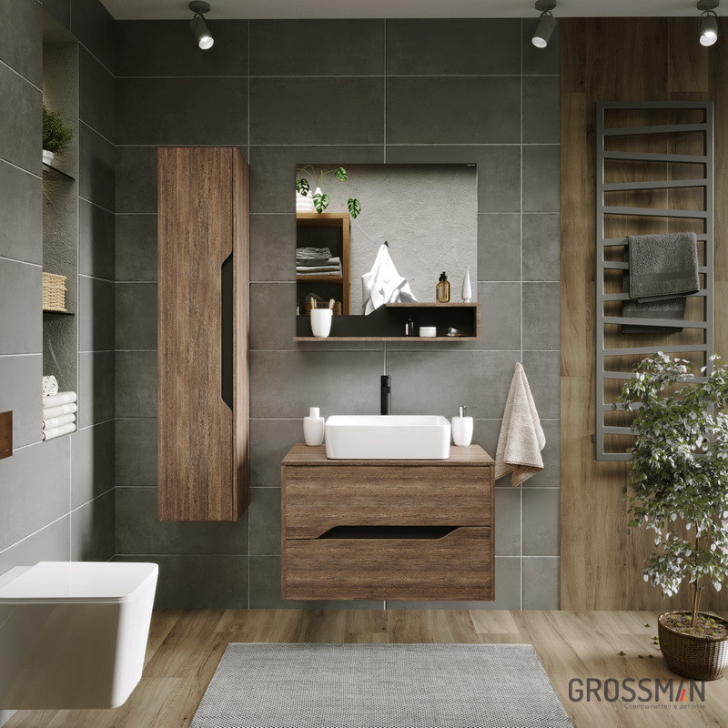 Тумба подвесная Лайф 80 см имеет два вместительных выдвижных ящика с врезными ручками в плоскости фасада. Ящики комплектуются шариковыми направляющими скрытого монтажа, с доводчиками. Верхний ящик оснащен защитой от конденсата с органайзером для хранения мелких предметов. Тумба выполнена из влагостойких материалов устойчивых к перепадам температуры и высокой влажности. Корпус и фасады - МДФ в пленке винтажное дерево темное, вставки из ЛДСП графит. Тумба крепится к стене.