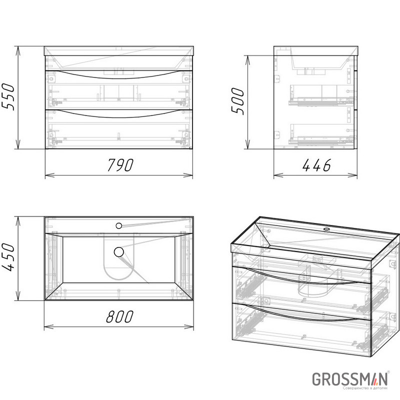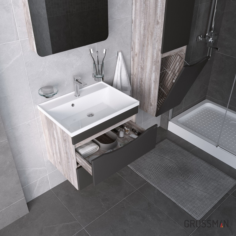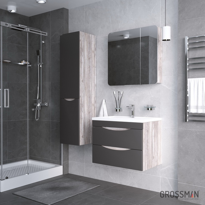 Тумба подвесная Талис-80 имеет два вместительных выдвижных ящика с врезными ручками в плоскости фасада. Ящики комплектуются шариковыми направляющими скрытого монтажа, с доводчиками. Корпус и фасады тумбы изготовлены из влагостойких материалов, устойчивы к перепадам температуры и высокой влажности, крепится к стене и не занимает место на полу. Корпус: ЛДСП бетон пайн; фасады: МДФ, ПВХ - пленка графит матовый. Подвесы для крепления тумбы - в комплекте.
