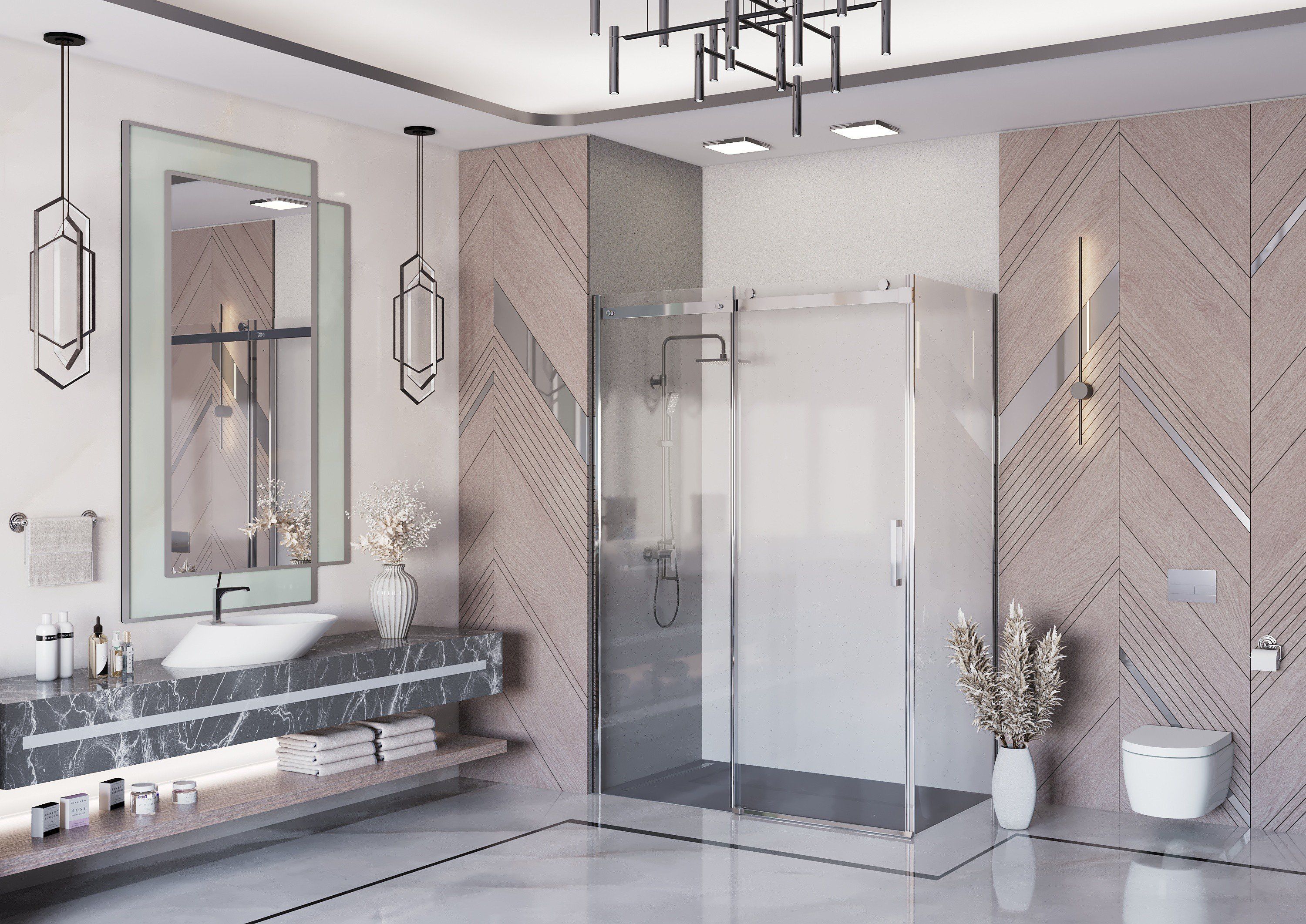 Вертикальные профили, кронштейны для стабилизации ограждений, латунные ручки, планка порога, внутренние и наружные части петель изготовлены в отделке SlimChrome+, придающей максимальную утонченность и блеск для сочетания со смесителем и душем.