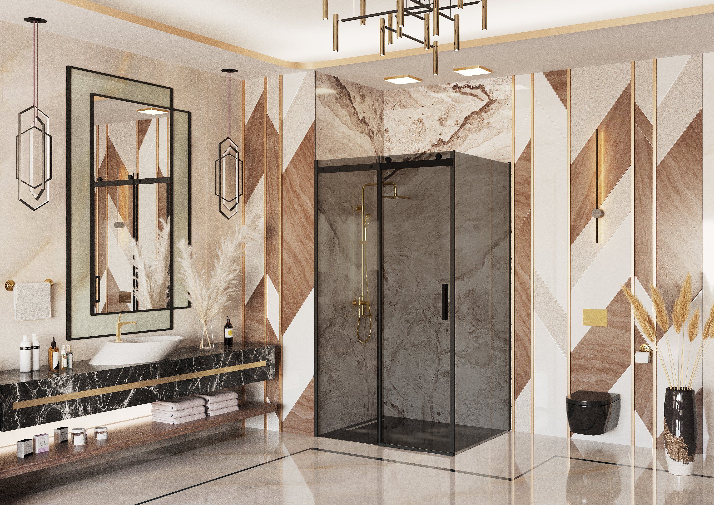 Вертикальные профили, кронштейны для стабилизации ограждений, латунные ручки, планка порога, внутренние и наружные части петель изготовлены в отделке SlimChrome+, придающей максимальную утонченность и блеск для сочетания со смесителем и душем.